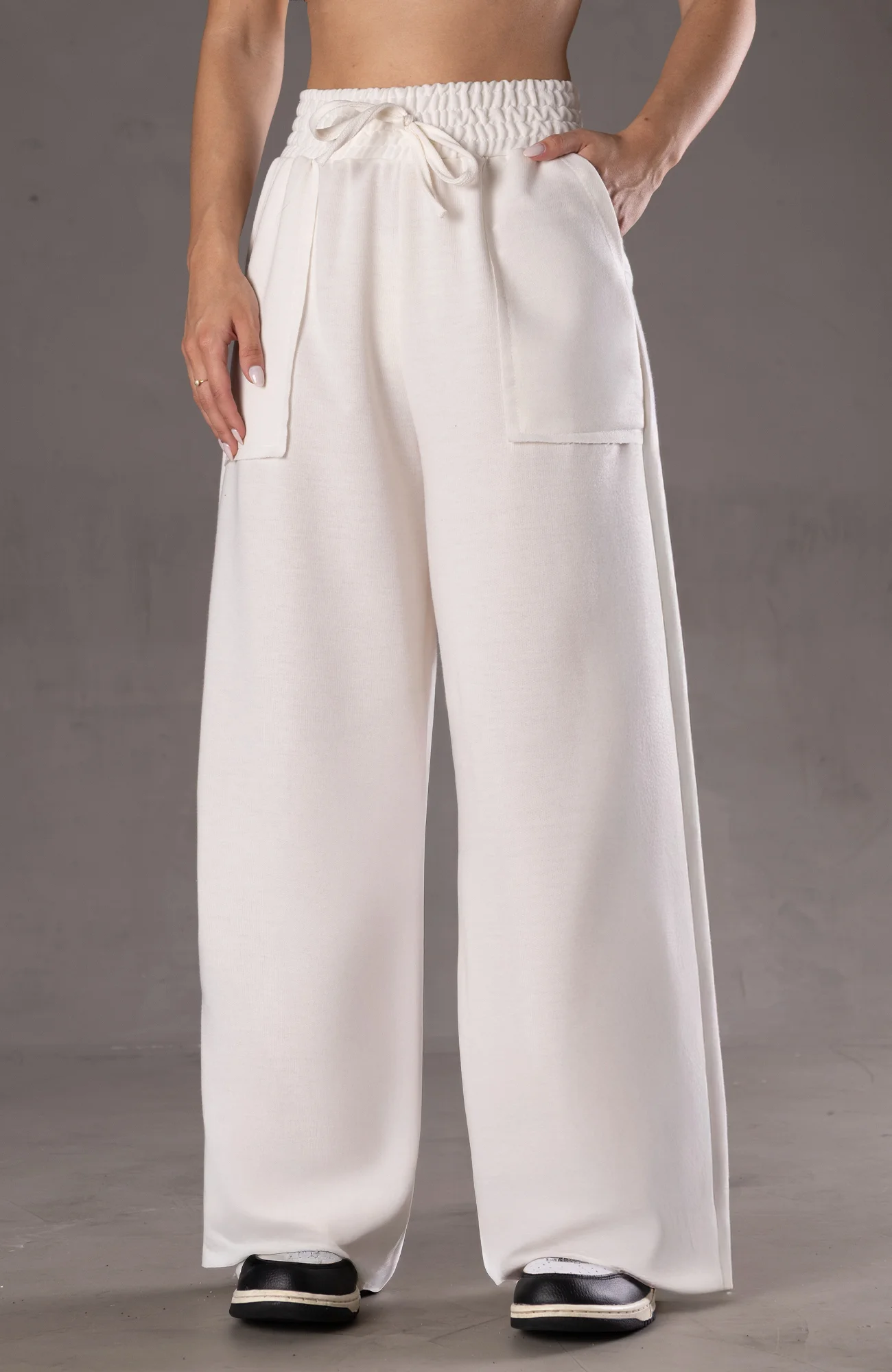 A calça pantalona de moletinho é uma peça de roupa confortável e estilosa, conhecida por sua modelagem ampla e elegante, combinada com o moletinho, um tecido macio e casual, frequentemente utilizado em roupas de lazer.